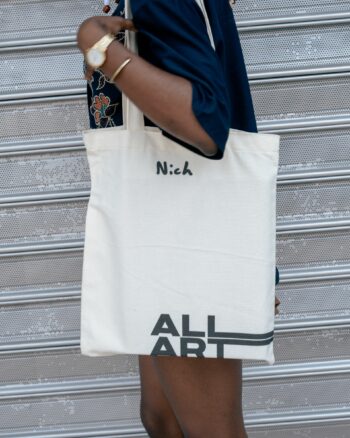Tote bag en toile avec logo NICH et slogan ALL ART contrastant et poignées.